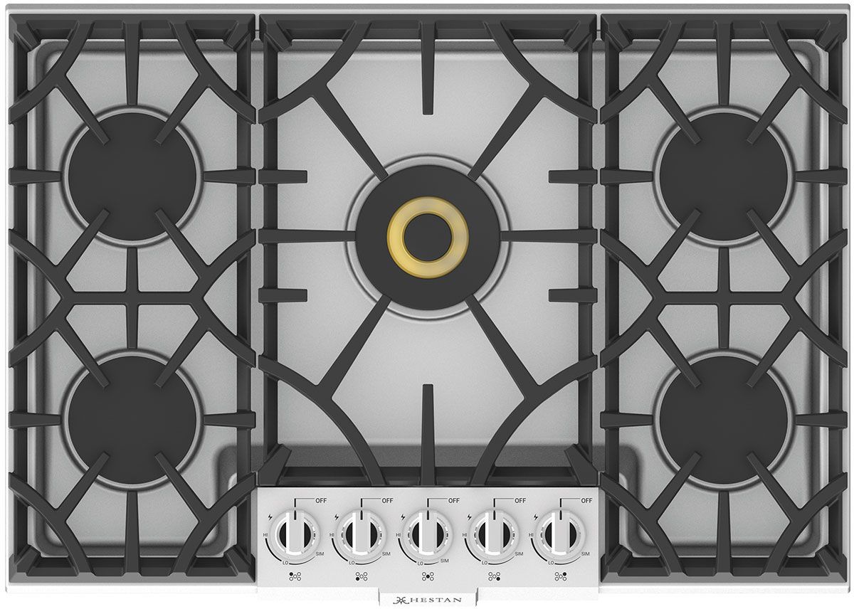 Hestan gas cooktops deliver extraordinary power and control to standard countertops. The center power burner provides a searing 20,000 BTUs – perfect for steaks, chops and large stockpots. On the other end of the culinary spectrum, the pro-simmer setting maintains a gentle flame for the most delicate dishes and sauces. And the continuous grates and backlit knobs combine stunning form and function – not to mention elegant style.
