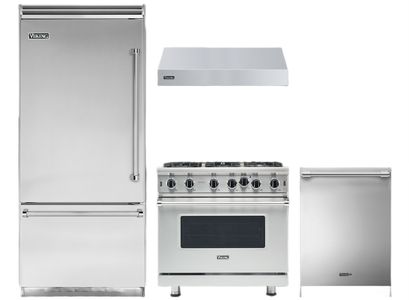 Viking® 4 Piece Stainless Steel Kitchen Package with a vbottom freezer refrigerator, pro style natural gas range, built in dishwasher, wall mounted range hoodRead More