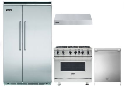 Viking® 4 Piece Stainless Steel Kitchen Package with a side-by-side refrigerator, pro style natural gas range, built in dishwasher, wall mounted range hoodRead More